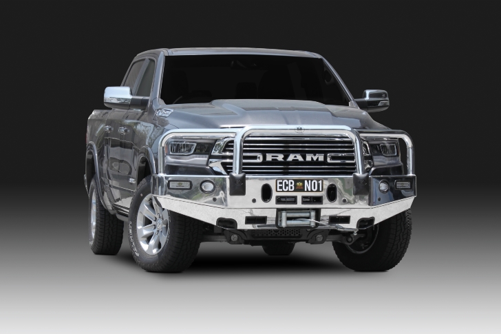For the ultimate in frontal protection you will find it hard to go past the strength, quality and style of the ECB Alloy Winch Bullbar with Bumper Lights for your Ram Laramie 1500 DT. To suit 2019 RAM 1500 DT (Laramie, Longhorn Edition, Limited, SXT, Sport and Rebel). The single piece channel is fully welded and manufactured from high tensile, structural grade alloys to provide maximum strength. This no compromise design is engineered to accommodate up to a 16,000lb low mount winch that is attached to the chassis as part of the specifically designed steel mounting system ensuring a neat and sturdy fit. Our Winch Bullbar with Bumper Lights incorporates a full width, braced lower protection skirt. ECB LED light combinations, bumper lights, air directional cooling vents and an aerial bracket are all standard features. Your ECB Winch Bullbar with Bumper Lights is available in a mirror polished finish or choose from one of our low maintenance powder coat finishes. Our ECB Winch Bullbar with Bumper Lights is proudly manufactured in Australia and we offer a lifetime warranty.