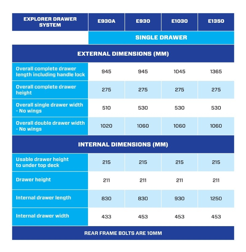 - Explorer Aluminium Storage Drawer Systems are available in 3 different lengths to suit popular wagons and dual cab utes. The 930 drawer system is 945mm long (overall complete drawer length including handle lock) and suits vehicles such as the Ford Everest, Toyota Fortuner, 150 Series Prado, 120 Series Prado and 76 Series Wagons. The 1030 drawer system is 1045mm long (overall complete drawer length including handle lock) and suits vehicles such as the 200 Series & 100 Series Land Cruisers. The 1350 drawer system is 1365mm long (overall complete drawer length including handle lock) and suits most dual cab utes!