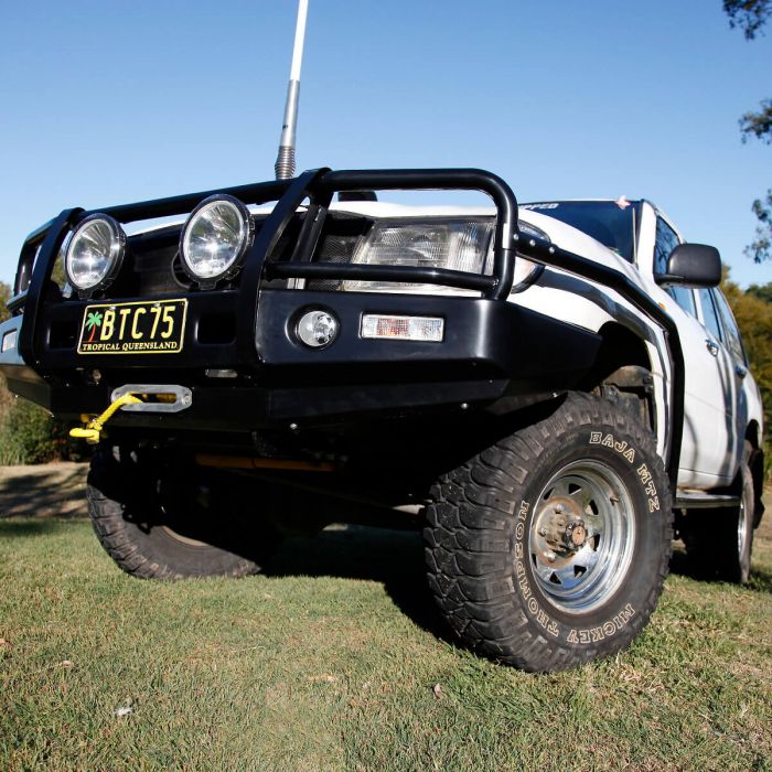 The TJM Outback Bullbar range offers exceptional frontal protection for your Toyota Landcruiser 105 Series, coil suspension. If you’re after a Bullbar that offers both style and unbeatable performance, you can’t go past the TJM Outback bar. When you’re off-road, our tapered side-wing design assists with approach angle to assist with sudden rises in the terrain. This TJM Outback bull bar is 4×4 equipped with a steel winch-mount, fog lights, combination lights, and reinforced T-slot recovery jack points. It’s ready to work for you with dual aerial mounts and mounting points for installing large driving lights. Combining classic styling with premium features, TJM’s Outback bull bar range offers uncompromised frontal protection for your 4×4.